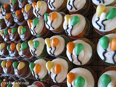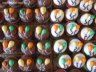 Rainbow swirled cupcakes topped with fondant balloons.